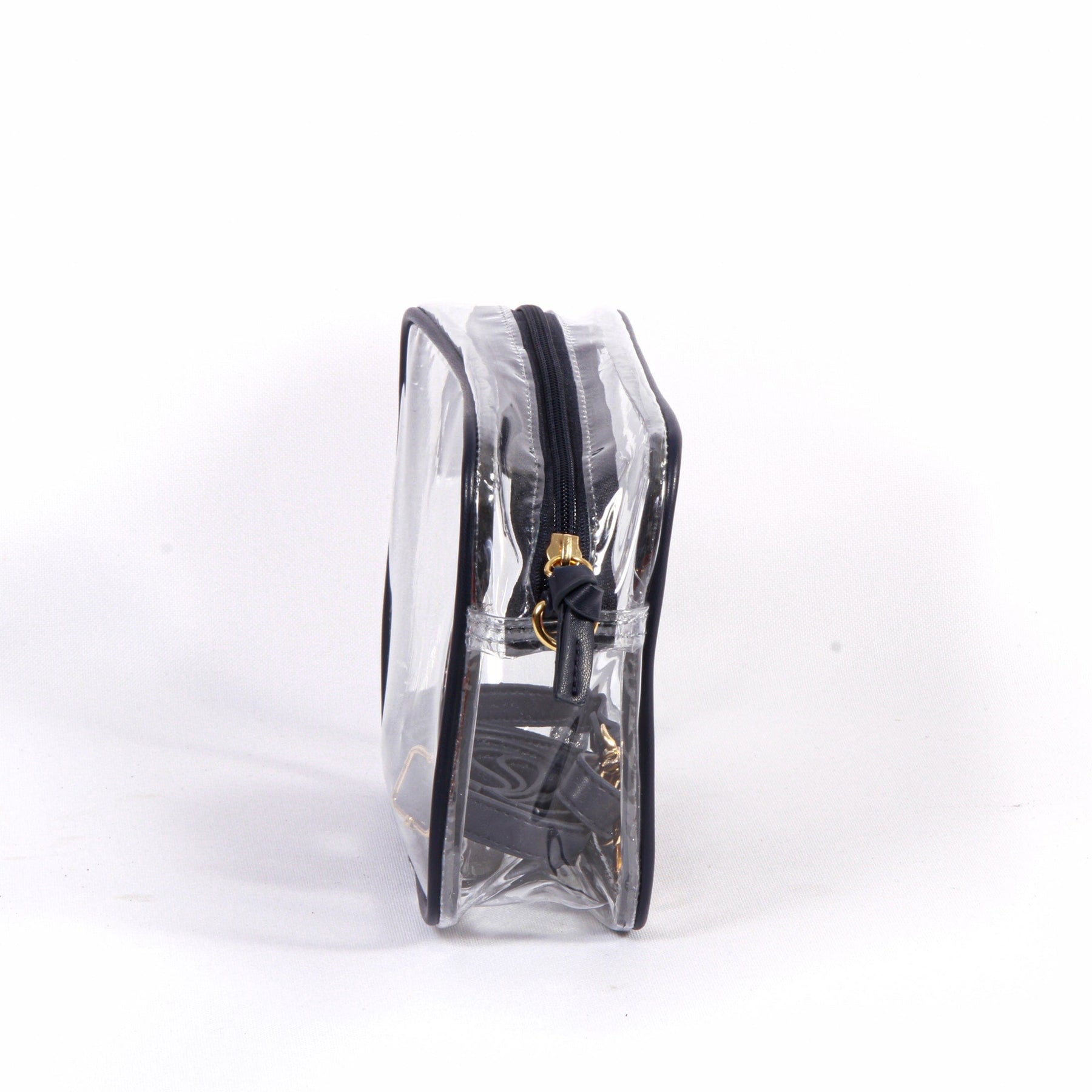 Crafted of clear vinyl and soft vegan leather, featuring brass hardware accents