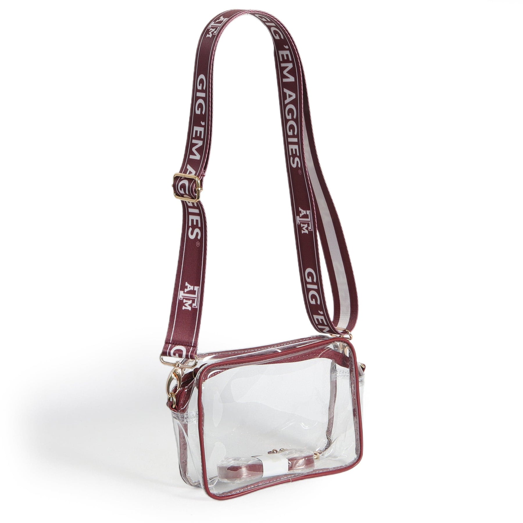 Get ready to show off your game day style with the Bridget Clear Purse featuring Texas A&M logos and a printed shoulder strap. Stay stylish and compliant with clear bag policies while representing your team in a unique way. Perfect for passionate fans and fashion-forward individuals alike!